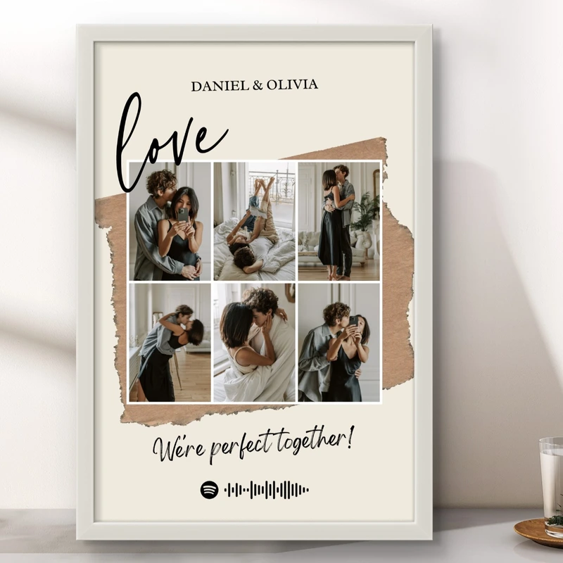 Celebrate your unique love story with our Personalized Love Collage Frame! This beautifully crafted frame features a collection of six heartwarming photos that capture your most tender moments as a couple. Adorned with your names and the sweet affirmation ‘We’re perfect together!’ this piece is more than just decor; it’s a testament to your bond. The added touch of an audio waveform graphic adds a modern twist to this classic display of affection. Ideal for anniversaries, Valentine’s Day, or just because—this custom frame is sure to be cherished for years to come.